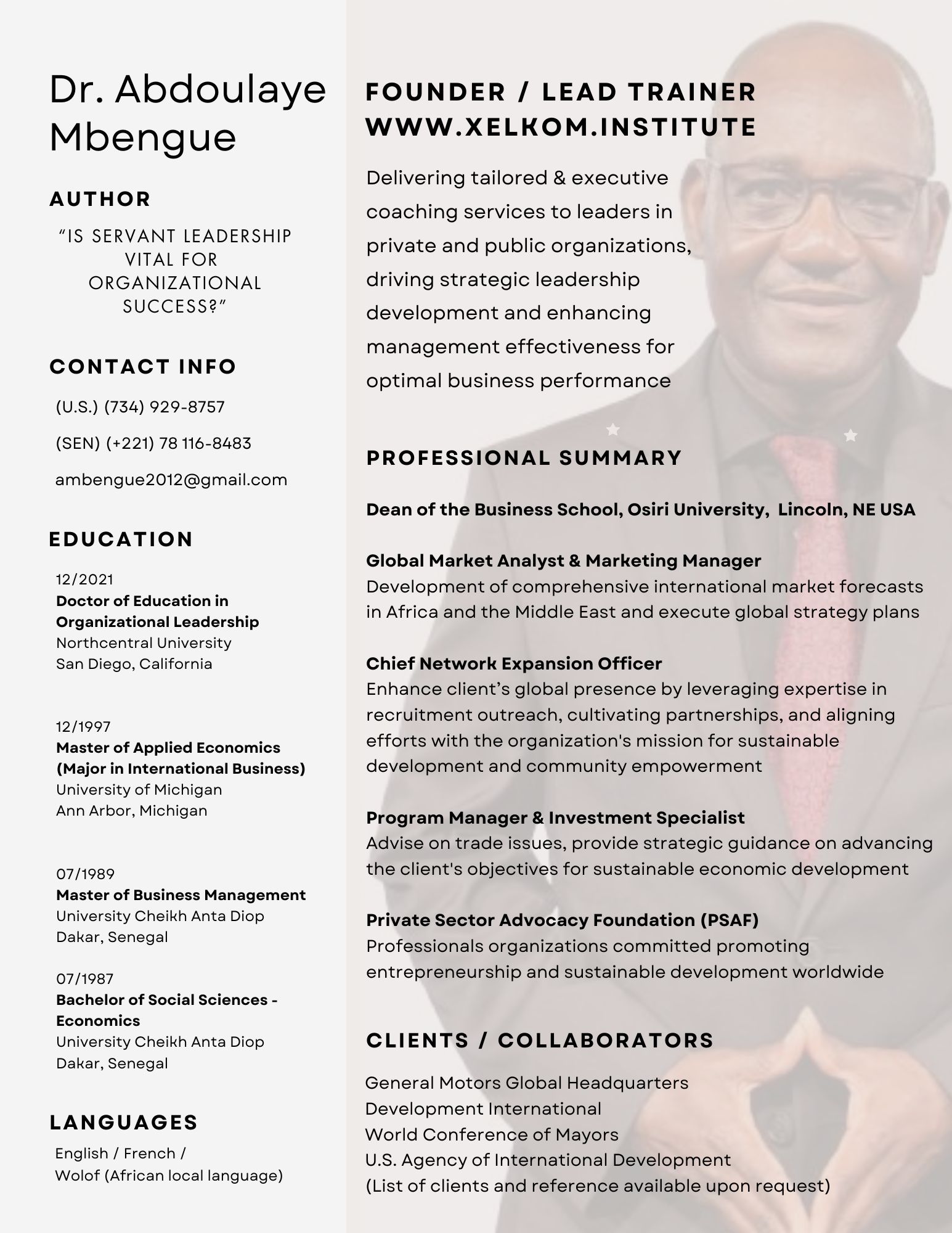 Dr. Abdoulaye Mbengue is a globally recognized leadership coach with over four decades of experience in executive coaching, business strategy, team building, and cross-cultural management. He has worked with leaders from Fortune 500 companies, international organizations, and government agencies, transforming their organizations through his unifying leadership framework. Dr. Mbengue serves as the Founder and Executive Director of the Xelkom Institute, Dean of Business at Osiri University, Pan-African Diplomatic Coordinator and Chair of the 2024 National Black Business Conference. He also a Board Member of The World Conference of Mayors, a former Director of The Mayor John Smith Leadership Institute. Moreover, he serves as a professor of leadership and strategy at various universities across the globe.